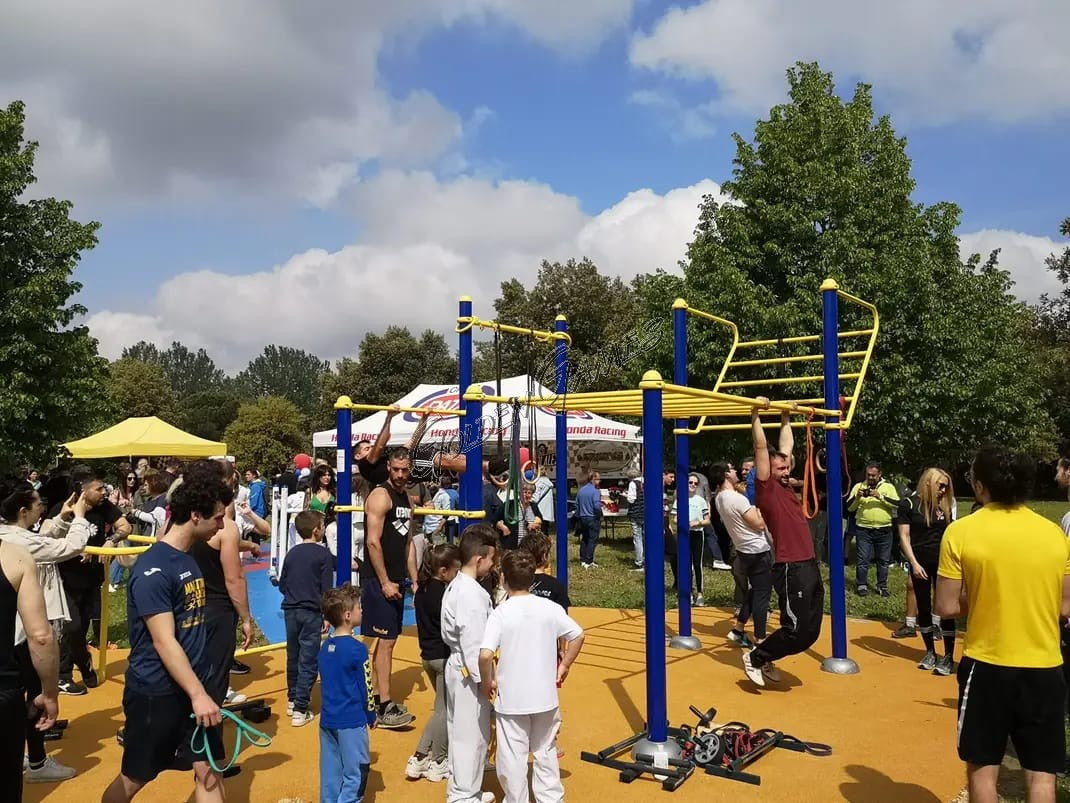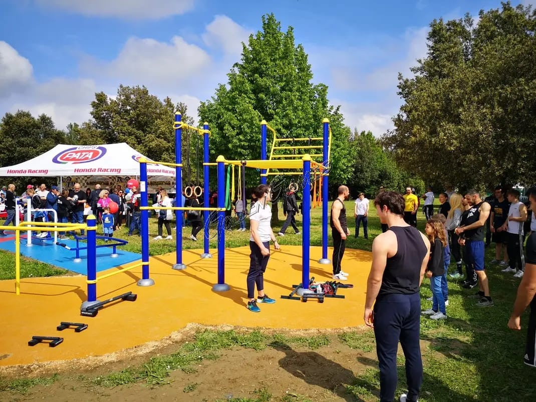 Fitness park per esterni in acciaio zincato di alta qualità e conforme alla UNI EN 16630.