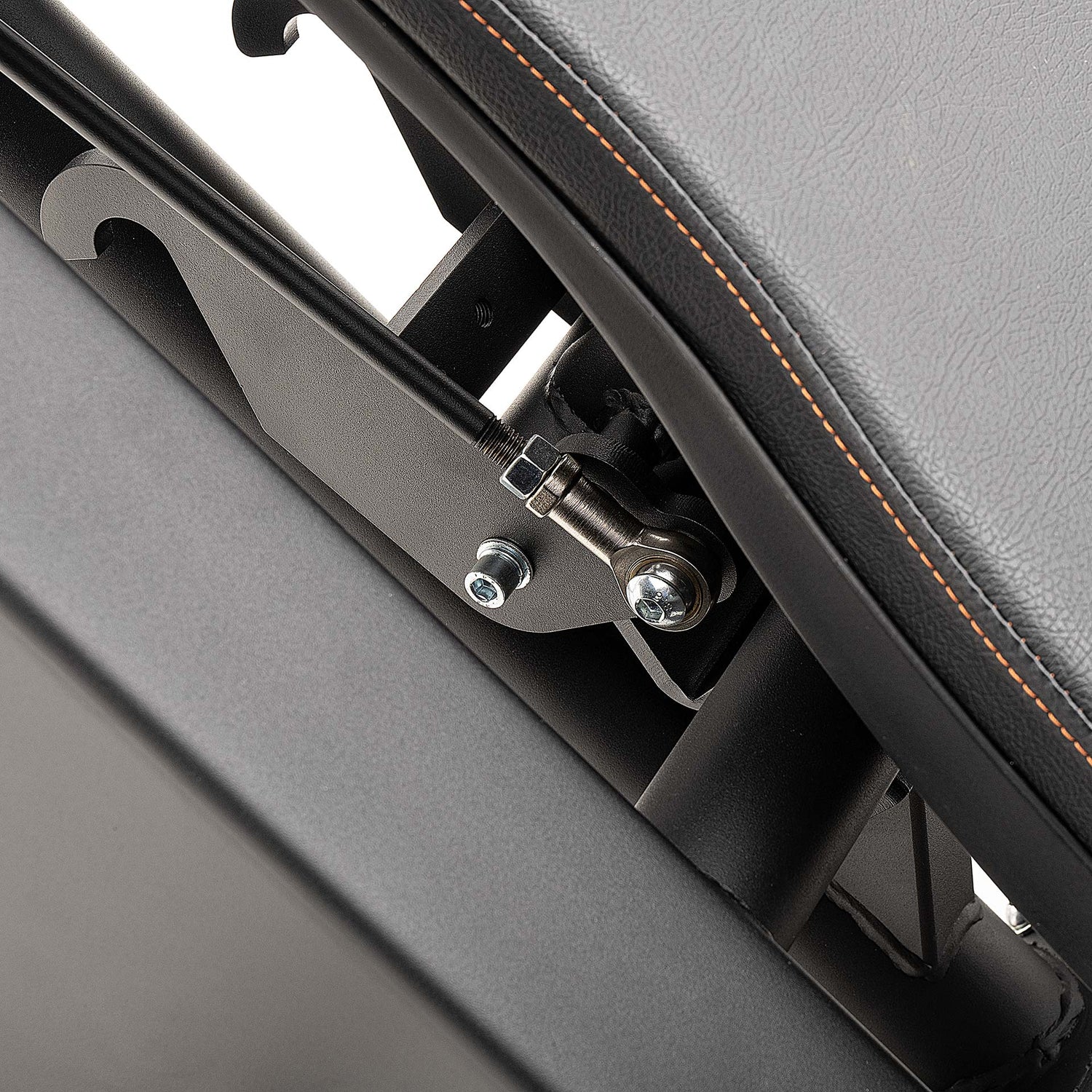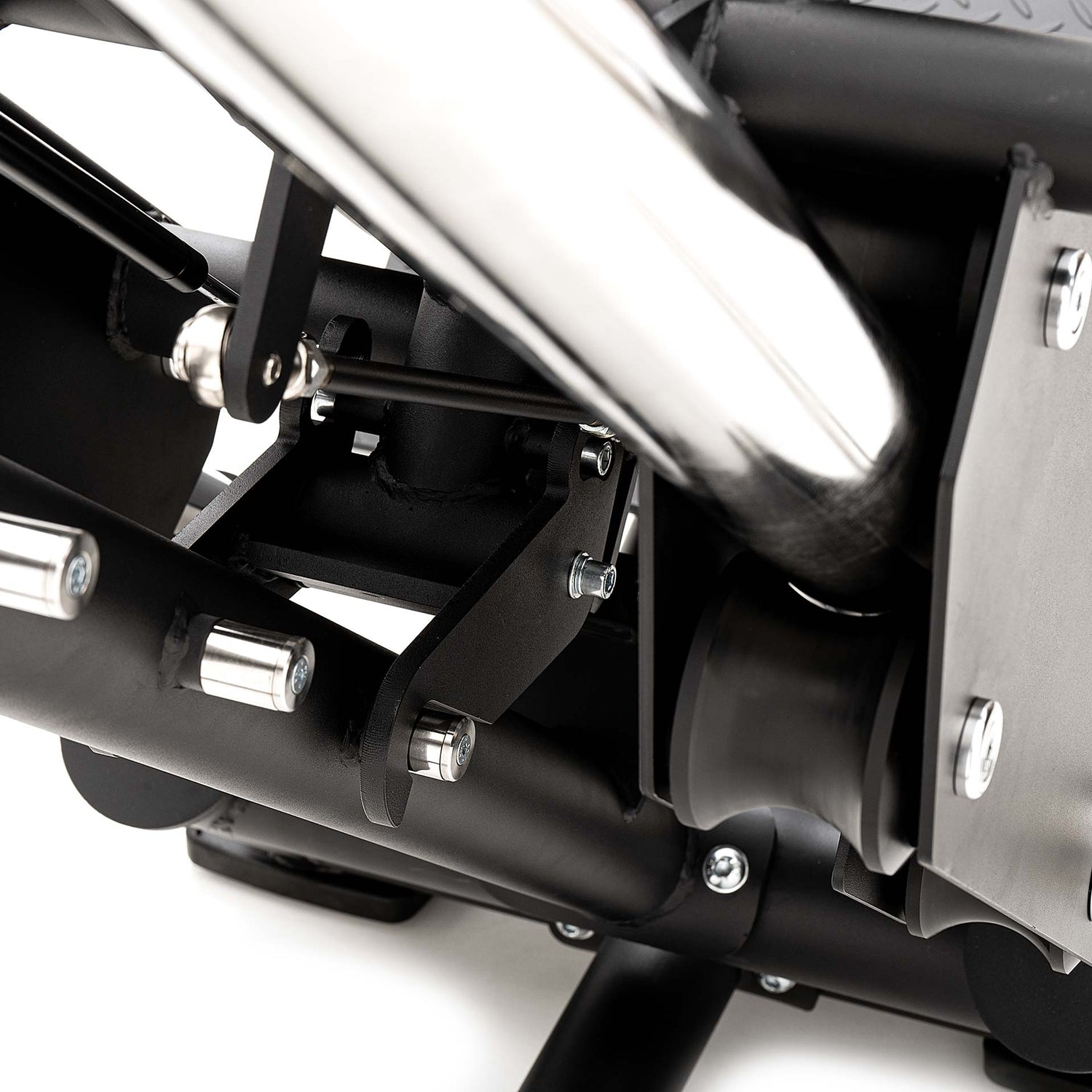 Il Linear Hack Squat della Serie 550 adotta, nel telaio principale, un tubo di alta qualità ø 89 x 3 mm, Q235. Le aste di guida adottano materiale in acciaio legato ø 75mm, con finitura “hard chrome”, resistente e liscia. Imbottitura in schiuma ad alta densità, tappezzeria in pelle PU “per arredamenti” e carter di protezione in ABS. Pedana regolabile. Il macchinario supporta senza problemi un carico fino i 400 kg.