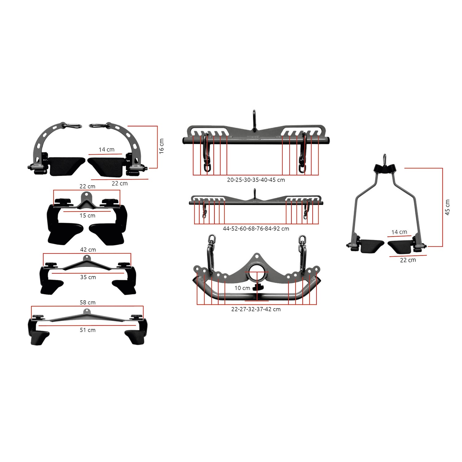L’Adjustable Grip Set è un set di impugnature regolabili che porta la versatilità a un nuovo livello grazie a 8 accessori che aggiungono una dimensione completamente nuova all’allenamento. Il set è composto da: