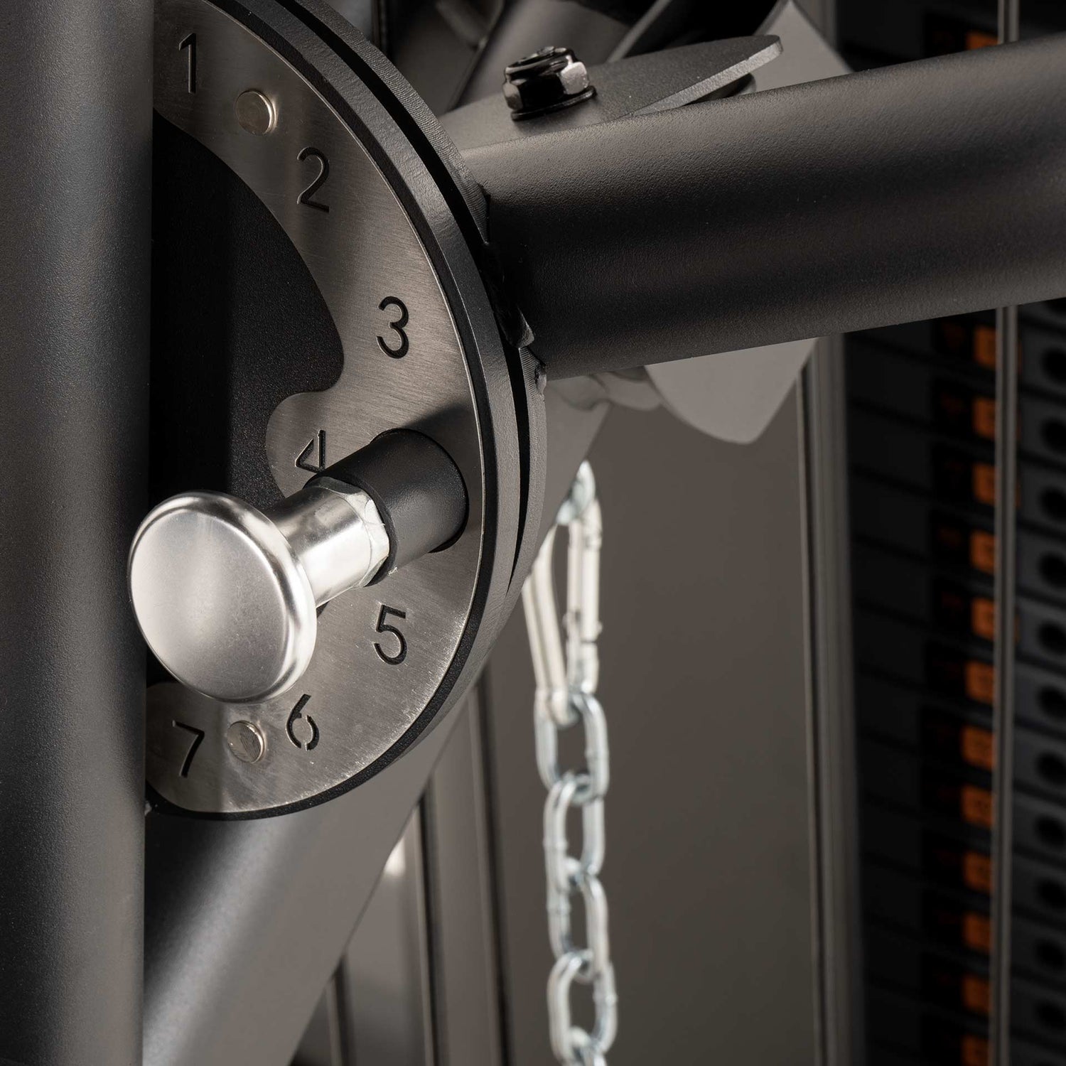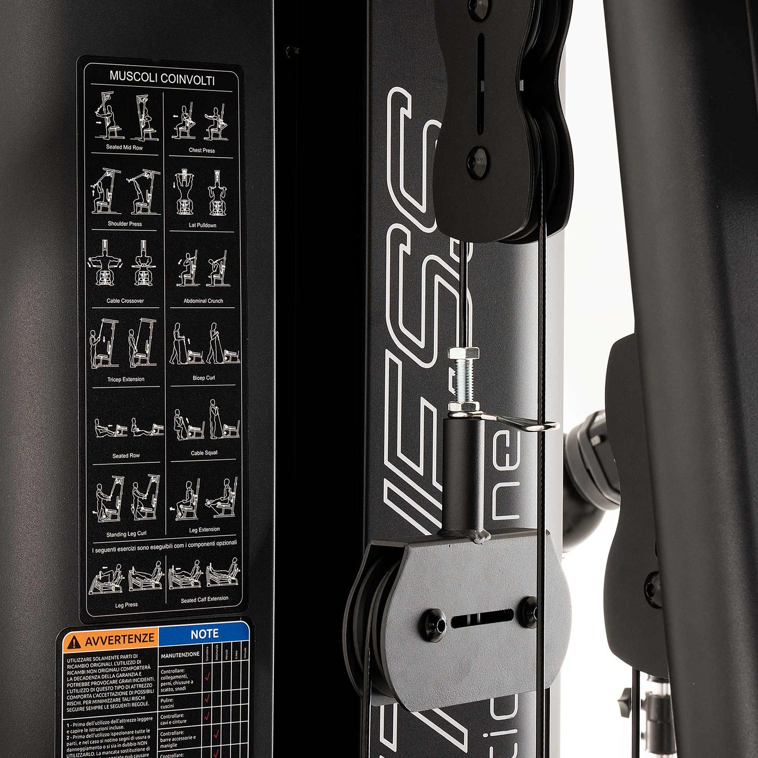 - Caratteristiche: braccia laterali regolabili a 7 altezze, Chest/row arms regolabili in 11 inclinazioni, in dotazione: 2 maniglie in nylon, 1 corda per bicipiti, 1 barra per lat pulldown, 1 barra corta bicipiti , guida per esercizi, pacco pesi in acciaio da 90 kg, sistema di carrucole e pulegge con cuscinetti a sfera High Performance, sistema di cavi in acciaio intrecciati rivestiti in poliuretano