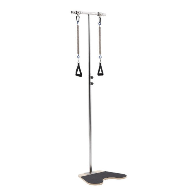 The device consists of a wooden base and a vertical steel pole, to which springs with handles are attached. The springs' position is adjustable and is used to perform a variety of standing exercises, including arm resistance and core strengthening. The height-adjustable steel frame rests on an oak footboard with a non-slip coating. The spring attachment width is adjustable via a selection pin. It can be wall-mounted for added stability. Improving coordination, overall balance, and strength, it tones the core and upper body while improving posture. The Ped-o-Pull allows for standing stretches and lengthening through targeted exercises. The muscles that support the joints can be strengthened safely, without stress or injury.