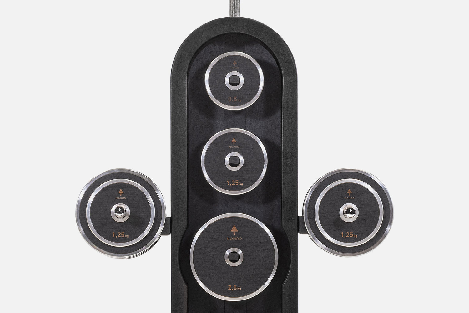 NOHRD weights perfectly combine functionality and aesthetics. Each plate is covered on both sides with stained oak veneer. The WeightPlate tower offers a sleek, space-saving storage space for convenient access to your equipment during workouts.